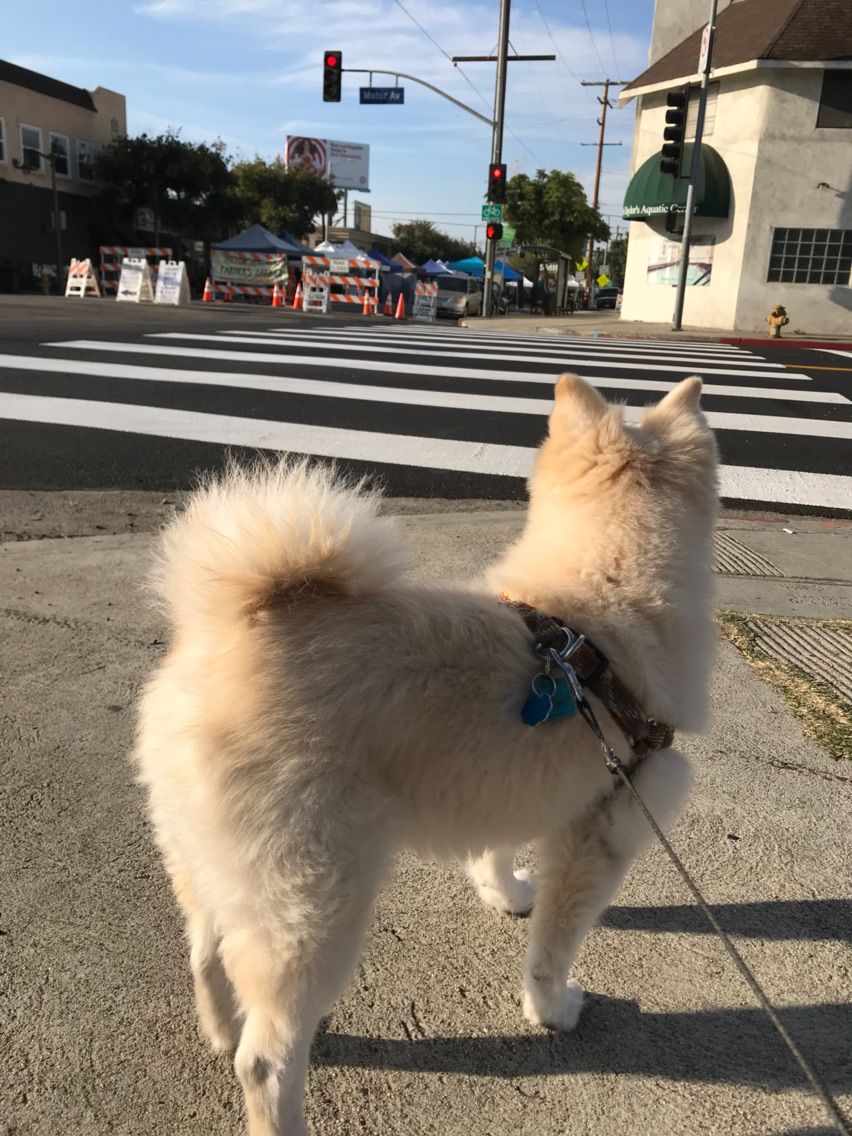 モコの目線の先にあるのは、大好きな日曜日のファーマーズマーケット。ここでやってるデイケアに通うのが日曜日の日課。